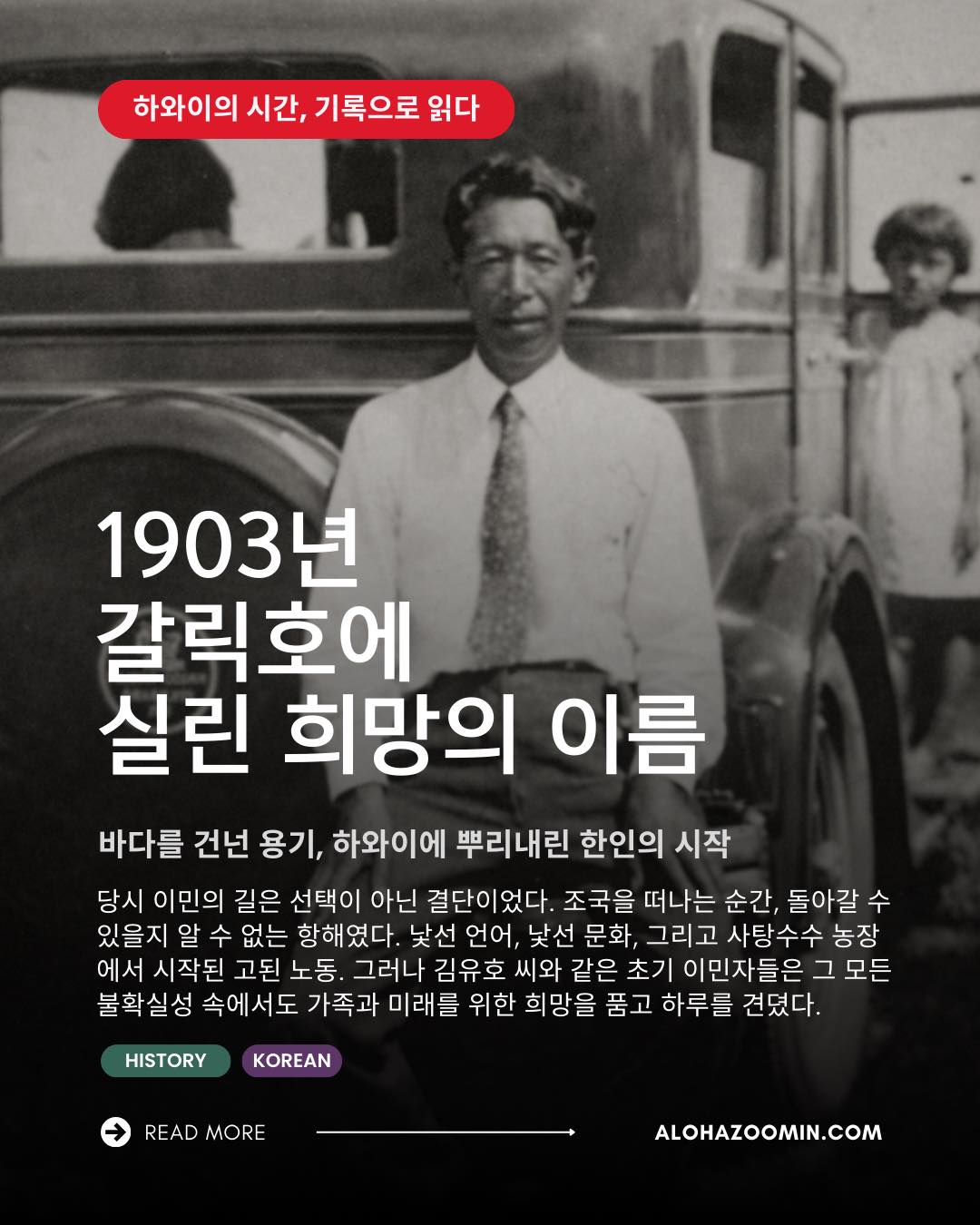 1903년 갈릭호를 타고 하와이에 도착한 김유호 이민 1세(사진). 한 장의 기록이 이민의 시작을 말해준다. …